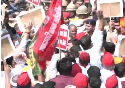 यहाँ विक्मादत्यि मार्ग स्थित सपा कार्यालय से अखिलेश सुबह लगभग दस बजे पार्टी के सभी विधायकों के साथ पैदल निकले। उनके साथ विधान सभा और विधान परिषद में सपा के सभी विधायक पैदल मार्च कर रहे हैं।