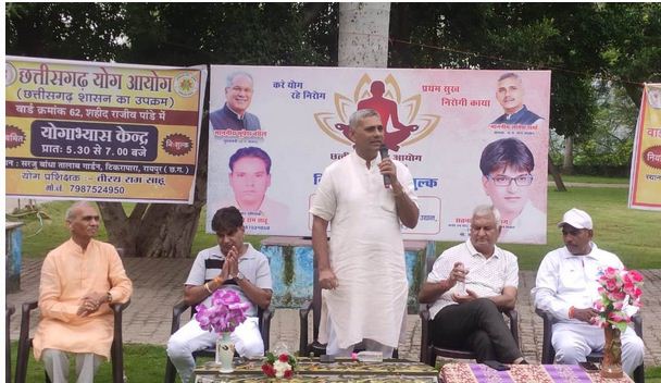 रायपुर. नागरिकों को शारीरिक और मानसिक रूप से स्वस्थ रखने तथा उनके दिनचर्या में योग को शामिल करने के उद्देश्य से छत्तीसगढ़ योग आयोग के तत्वाधान में रायपुर नगर निगम द्वारा नियमित योगाभ्यास कार्यक्रम के अंतर्गत लगातार राजधानी रायपुर के विभिन्न स्थानों में निःशुल्क योगाभ्यास केन्द्र प्रारंभ किये जा रहे हैं। इसी तारतम्य में आज छत्तीसगढ़ योग आयोग के अध्यक्ष श्री ज्ञानेश शर्मा के मुख्य आतिथ्य में टिकरापारा, वार्ड क्र. 62, शहीद राजीव पांडे वार्ड के सरयू बांधा तालाब गार्डन रायपुर में 21 वें निःशुल्क नियमित योगाभ्यास केंद्र का शुभारंभ किया गया। इस अवसर पर विशेष अतिथि के रुप में वार्ड के पार्षद श्री सतनाम सिंह पनाग, छ.ग. योग आयोग के सचिव श्री एम एल पाण्डेय, योग आयोग के अधिकारी और योग साधक सहित वार्ड के नागरिकगण उपस्थित रहे। योगाभ्यास का संचालन योग प्रशिक्षक श्री तीरथ राम साहू द्वारा प्रतिदिन सुबह 06 से 07 बजे तक सरयू बांधा तालाब गार्डन, टिकरापारा, रायपुर में किया जाएगा।