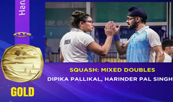 हांगझोउ, दीपिका पल्लीकल और हरिंदर पाल सिंह संधू की जोड़ी ने गुरुवार को एशियाई खेलों के इतिहास रचते हुए स्क्वैश मिश्रित युगल स्पर्धा में पहला स्वर्ण पदक जीत लिया है।आज यहां हुए मुकाबले में भारतीय जोड़ी ने फाइनल में मलेशिया के आइफा अजमान और मोहम्मद सयाफिक कमाल को 11-10, 11-10 से हराया। इस जोड़ी ने अपने सभी एशियाड मुकाबलों में सिर्फ दो गेम गंवाए थे।यह एशियाई खेलों में दीपिका का पहला स्वर्ण पदक है, जबकि संधू ने महाद्वीपीय प्रतियोगिता में अपना तीसरा पदक जीता। स्क्वैश मिश्रित युगल की सफलता ने 19वें एशियाई खेलों में भारत के स्वर्ण पदकों की संख्या 20 हो गयी है।