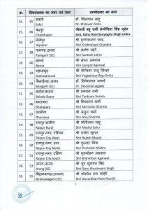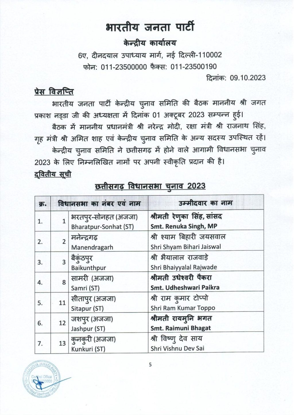 भारतीय जनता पार्टी केन्द्रीय चुनाव समिति की बैठक माननीय श्री जगत प्रकाश नड्डा जी की अध्यक्षता में दिनांक 01 अक्टूबर 2023 सम्पन्न हुई। बैठक में माननीय प्रधानमंत्री श्री नरेन्द्र मोदी, रक्षा मंत्री श्री राजनाथ सिंह, गृह मंत्री श्री अमित शाह एवं केन्द्रीय चुनाव समिति के अन्य सदस्य उपस्थित रहें। केन्द्रीय चुनाव ‘ समिति ने छत्तीसगढ़ में होने वाले आगामी विधानसभा चुनाव 2023 के लिए निम्नलिखित नामों पर अपनी स्वीकृति प्रदान की है।