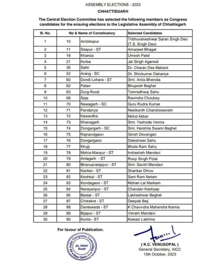 कांग्रेस केंद्रीय चुनाव समिति द्वारा आसन्न विधानसभा चुनावों के लिए 30 नामों की प्रथम सूची जारी कर दी गई है।