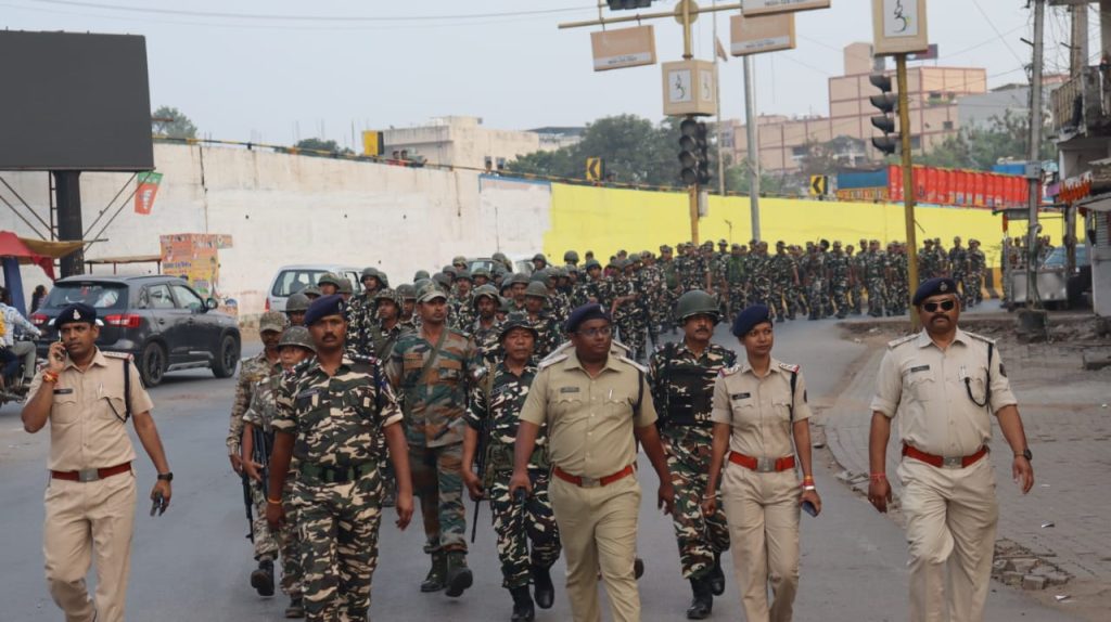 अतिरिक्त पुलिस अधीक्षक आकाश राव, जिले के सभी DSP/SDOP, अर्धसैनिक बलो के अधिकारी व जवान व नगरसेना के जवान फ्लैग मार्च में हुए सम्मिलित