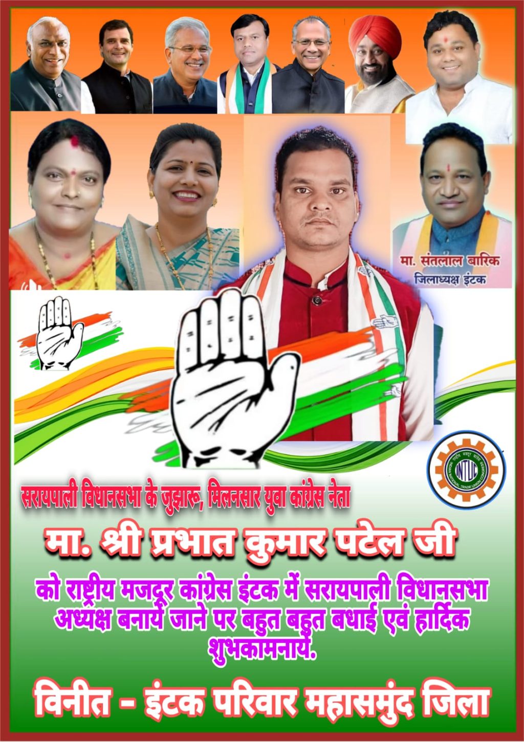 छत्तीसगढ़ प्रदेश कांग्रेस कमेटी के अध्यक्ष दीपक बैज की सहमती एवं छत्तीसगढ़ प्रदेश राष्ट्रीय मजदूर कांग्रेस के अध्यक्ष श्री के सूरज की अनुशंसा पर जिला कांग्रेस कमेटी महासमुंद राष्ट्रीय मजदूर कांग्रेस इंटर में सरायपाली विधानसभा अध्यक्ष के पद पर श्री प्रभात कुमार पटेल को नियुक्त किया गया है ।