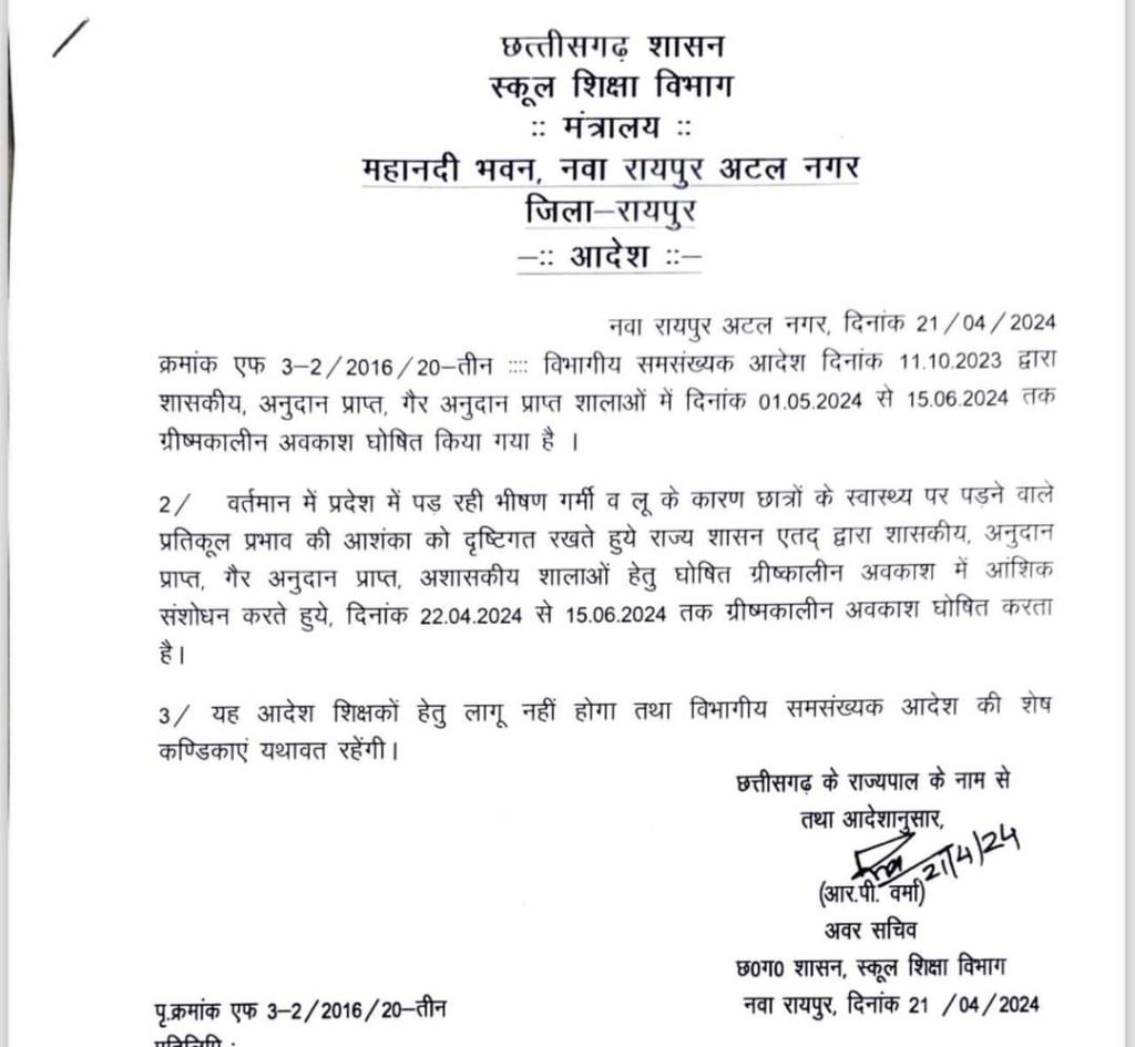 राज्य शासन ने बढ़ते हुए गर्मी को देखते हुए बच्चों के स्वास्थ्य को ध्यान में रखकर ग्रीष्मकालीन अवकाश का आदेश जारी कर दिया है!