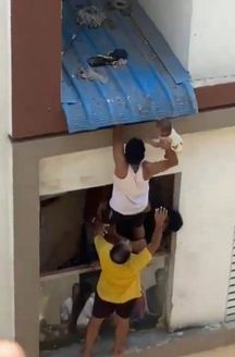 सात माह के बच्चे को लेटा देख हर कोई हैरान रह गया। हर कोई उसे बचाने की जी तोड़ कोशिश करने लगा। बच्चे को कैसे बचाया गया यह वीडियो में देखा जा सकता है। कुछ लोग बिल्डिंग के नीचे चादर लेकर खड़े हैं। कुछ लोगों ने पहली मंजिल की खिड़की पर चढ़कर संघर्ष कर बच्चे की जान बचाई है।