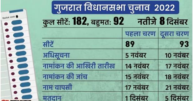 मुख्य चुनाव आयुक्त राजीव कुमार ने आज यहां एक संवाददाता सम्मेलन में गुजरात में मतदान के कार्यक्रम की घोषणा की। उन्होंने बताया कि दक्षिण गुजरात, सौराष्ट्र और उत्तर गुजरात के कुछ भाग की कुल 89 सीटों पर मतदान एक दिसंबर को और मध्य गुजरात एवं उत्तर गुजरात की बाकी कुल 93 सीटों पर पांच दिसंबर को मतदान होगा।