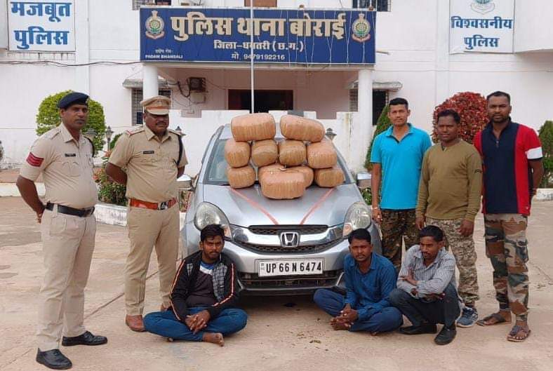अति.पुलिस अधीक्षक श्रीमती मेघा टेभुरकर साहू के मार्गदर्शन में एसडीओपी. नगरी मयंक रणसिंह, डीएसपी. (नक्सल आप्स.) आर० के० मिश्रा के नेतृत्व में थाना प्रभारी श्री युगलकिशोर नाग द्वारा दिनांक 01.11.22 को नाकाबंदी पाईंट एवं जांच कार्यवाही की जा रही थी तभी उड़िसा के तरफ से आते एक सिल्वर कलर के वाहन क्रमांक UP66N6474 होण्डा मोबिलियो कार में मादक पदार्थ गांजा का अवैध परिवहन करने के नियत से उड़िसा की ओर से आ रहे है कि मुखबीर से सूचना मिलने पर थाना बोराई के सामने बैरियर नाका में चेकिंग की जा रही थी थोडी देर बाद उक्त वाहन को रोककर चेक किया गया जिसमें तीन व्यक्ति बैठे मिले पुछताछ में गतिविधि संदिग्ध लगी तब उनका नाम पुछने पर 01 रामप्रकाश मिश्रा, पिता हीरालाल मिश्रा उम्र 22 वर्ष, साकिन ग्राम / पोस्ट दरसेंडा थाना सरदुवा जिला चित्रकूट (उत्तर प्रदेश ),. 02 पवन कुमार द्विवेदी पिता बंटा द्विवेदी उम्र 28 वर्ष साकिन ग्राम / पोस्ट दरसेंडा थाना सरदुवा जिला चित्रकूट (उत्तर प्रदेश ), 03 कल्लू मुसलमान पिता कोदा मुसलमान उम्र 34 वर्ष साकिन ग्राम/पोस्ट दरसेंडा थाना सरदुवा जिला चित्रकूट (उत्तर प्रदेश का होना बताये।