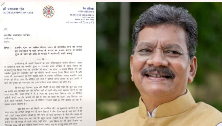 इस तरह से 25 लाख 93 हजार 880 क्विंटल धान 4000 रुपए प्रति क्विंटल की दर से 1037 करोड़ 55 लाख रुपए का धान खराब हो चुका है. यह एक बड़ी क्षति सुरक्षा और रखरखाव में घोर उपेक्षा के कारण हुई है. इन तथ्यों के साथ डॉ. महंत ने राज्यपाल से पूरे प्रकरण की जांच कराने के साथ उत्तरदायित्व निर्धारित कर अपने स्तर पर समुचित कार्रवाई का आग्रह किया है.
