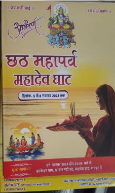2024 का छठ महापर्व महादेव घाट आयोजन समिति बहुत ही जोर-जोर से मनाने जा रही है जिसमें अंतर्राष्ट्रीय लोग गायिका कल्पना पटवारी जी प्रसिद्ध भोजपुरी गायक गायत्री यादव जी मुंबई के जाने-माने कलाकार प्रणिता राव पटनायक जी एवं छत्तीसगढ़ के प्रसिद्ध भजन सम्राट दुकालू यादव जी 7 नवंबर को संध्या 4:00 बजे से अपनी प्रस्तुति देने आ रहे हैं