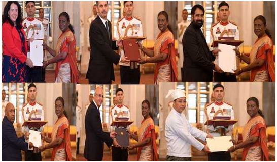नयी दिल्ली. छह देशों के राजनयिकों ने सोमवार को राष्ट्रपति द्रौपदी मुर्मु को अपने परिचय पत्र प्रस्तुत किये।