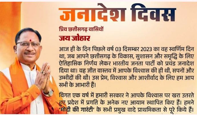 रायपुर। भाजपा को चुनाव में जनादेश मिले एक साल पूरा हो गया है. पिछले साल 3 दिसंबर को विधानसभा चुनाव की काउंटिंग हुई थी. मुख्यमंत्री विष्णु देव साय ने आज के दिन को जनादेश दिवस बताते हुए एक बार फिर छत्तीसगढ़ की जनता का आभार जताया है.