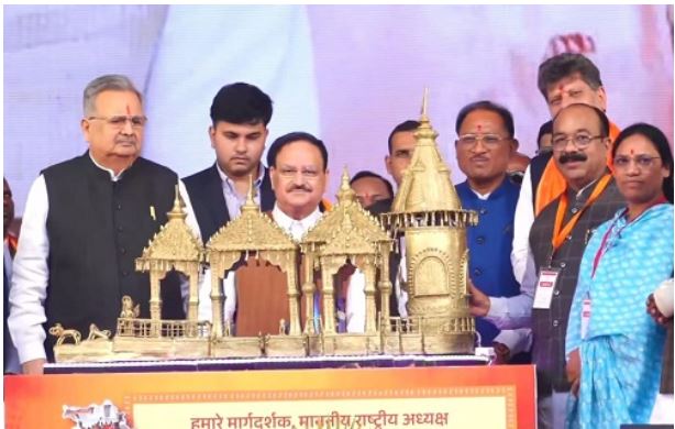 कोंडागांव। कोंडागांव के शिल्पकार राजेन्द्र बघेल द्वारा बनाई गई अयोध्या के राम मंदिर की ढोकरा शिल्पकला को मुख्यमंत्री विष्णु देव साय ने आज राजधानी रायपुर में आयोजित ‘जनादेश परब’ कार्यक्रम में केंद्रीय मंत्री जे. पी. नड्डा को भेंट किया। जिला प्रशासन के सहयोग से संचालित झिटकू मिटकू समिति के शिल्पकार द्वारा बनाई गई राम मंदिर के इस कलाकृति का लगभग 120 किलो वजन है और लम्बाई 4 फीट, ऊंचाई 30 इंच का है। भगवान श्री राम जी के जीवन से संबंधित राम दरबार एवं राम जी की मूरत के साथ ही माता सीता और लक्ष्मण जी की कलाकृति भी बनाई गई है। यह कलाकृति झिटकू मिटकू समिति बनाई गई है, जिसमें 40 सदस्य जुड़े हुए हैं। राजेन्द्र बघेल ढोकरा शिल्पकला परम्परागत पेशा हैं और परम्परागत पेशा होने के कारण जन्म से ही जुड़े हुए हैं। जिला प्रशासन के निर्देश पर भगवान श्री राम के जीवन से संबंधित शिल्पकला कलाकारों को बनाने हेतु निर्देश दिए गए थे। उक्त कलाकृति को बनाने में शिल्पकारों को तीन से चार माह लगे।