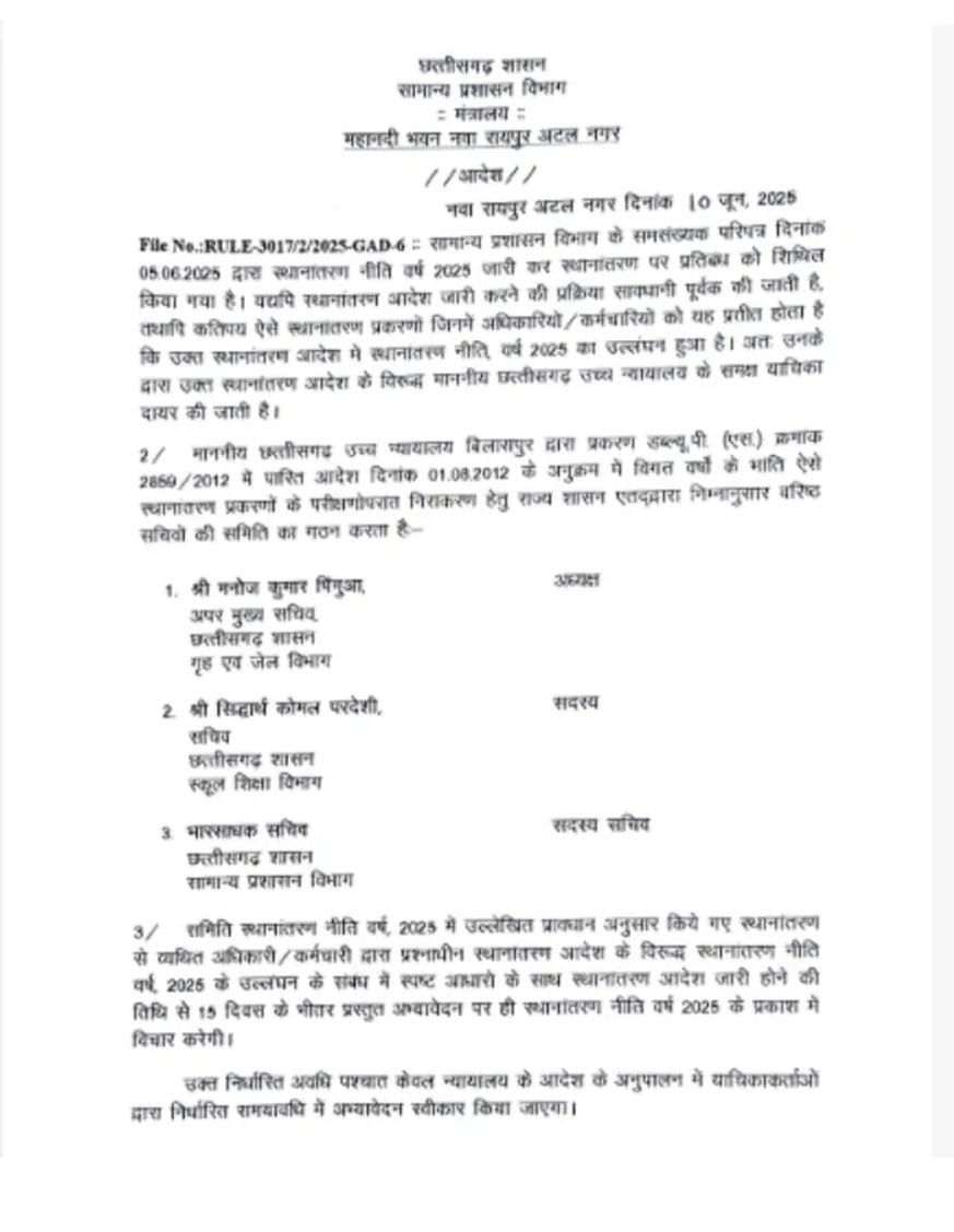 रायपुर :  छत्तीसगढ़ में ट्रांसफर से बैन हटने के बाद तबादलों के लिए आवेदन आ रहे हैं. अधिकारियों, कर्मचारियों के ट्रांफसर अभ्यावेदनों की सुनवाई के लिए सरकार ने आईएएस मनोज कुमार पिंगुआ की अध्यक्षता में तीन सदस्यीय कमेटी का गठन किया है. इसका आदेश सामान्य प्रशासन विभाग ने जारी किया है.