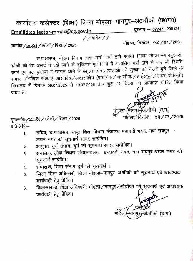 मोहला-मानपुर. छत्तीसगढ़ में लगातार बारिश से नदी-नाले उफान पर है. मौसम विभाग ने मोहला-मानपुर-अंबागढ़ चौकी जिले में भारी बारिश का रेड अलर्ट जारी किया है. जिले में बाढ़ की स्थिति बनने एवं पुल पुलिया में उफान आने से छात्रों की सुरक्षा को ध्यान में रखते हुए कलेक्टर ने मोहला-मानपुर-अंबागढ़ चौकी जिले के स्कूलों और आंगनबड़ियों में 9 जुलाई से 10 जुलाई तक दो दिन अवकाश का आदेश जारी किया है.