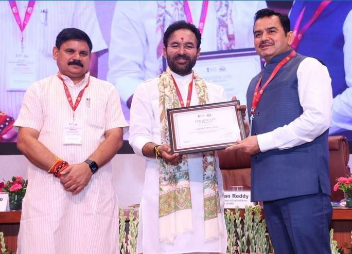 रायपुर. भारत सरकार के खान मंत्रालय, नई दिल्ली द्वारा छत्तीसगढ़ राज्य को जिला खनिज संस्थान न्यास (DMF) के अंतर्गत उल्लेखनीय कार्यों के लिए राष्ट्रीय स्तर पर सम्मानित किया गया है। आज नई दिल्ली स्थित स्कोप कन्वेंशन सेंटर में आयोजित एक दिवसीय “नेशनल डीएमएफ वर्कशॉप” के दौरान केंद्रीय कोयला एवं खान मंत्री श्री जी किशन रेड्डी ने मुख्यमंत्री के सचिव और खनिज सचिव श्री पी. दयानंद को प्रशस्ति पत्र देकर सम्मानित किया।
