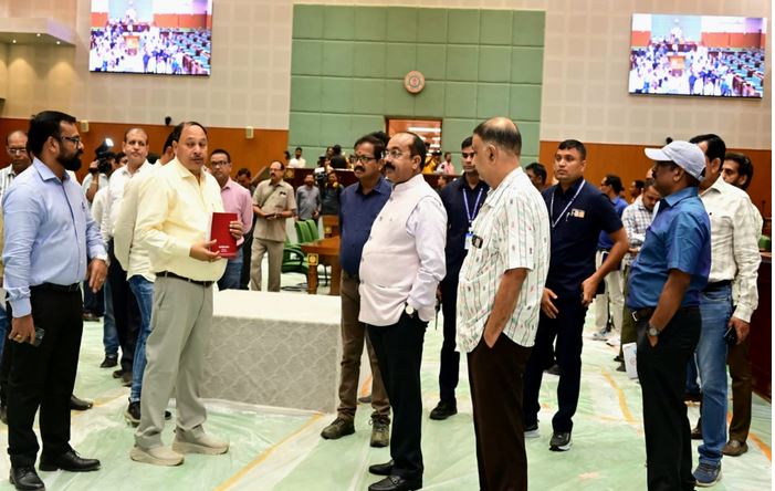 उप मुख्यमंत्री श्री साव ने नवीन विधानसभा परिसर में पूर्व प्रधानमंत्री स्वर्गीय श्री अटल बिहारी बाजपेयी की मूर्ति के अनावरण स्थल, विधानसभा के सदन और मंचीय कार्यक्रम के स्थल का जायजा लेकर अधिकारियों को आवश्यक निर्देश दिए। नवा रायपुर के सेक्टर-19 में मंत्रालय (महानदी भवन) और विभागाध्यक्ष कार्यालय (इंद्रावती भवन) के पीछे 51 एकड़ परिसर में विधानसभा का नया भवन बनाया गया है।
