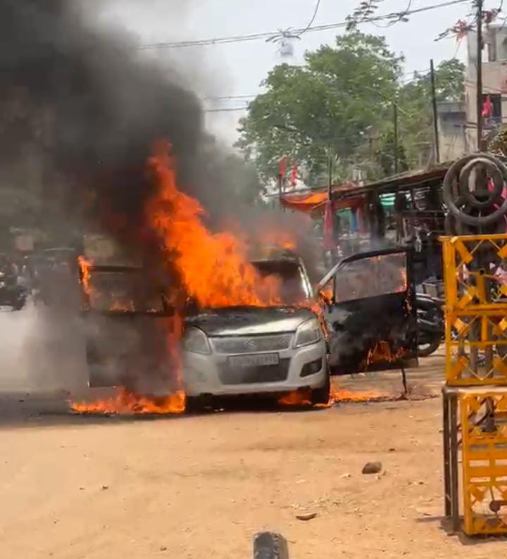 जय स्तंभ चौक, पदमपुर रोड पर अचानक एक कार में आग लग गई, आग लगता देख कार सवार ने कूदकर अपनी जान बचाई.