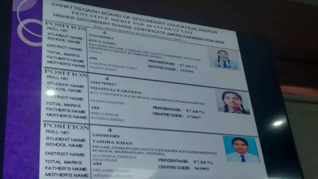 रायपुर। छत्तीसगढ़ 12वीं बोर्ड परीक्षा के नतीजे जारी हो गए हैं। रिया साहू ने टॉप किया है। मुख्यमंत्री विष्णुदेव साय और शिक्षा मंत्री गजेंद्र यादव ने रिजल्ट जारी किया। बता दें कि इस साल 10वीं-12वीं के टोटल 5.66 लाख स्टूडेंट्स ने बोर्ड एग्जाम दिया था। इनमें से 12वीं के 2,45,785 स्टूडेंट्स शामिल हैं। छात्र अपना रिजल्ट मंडल की वेबसाइट पर रोल नंबर डालकर सीधे देख सकते हैं।, 9 वेबसाइट पर स्टूडेंट्स अपना रिजल्ट देख सकते हैं।