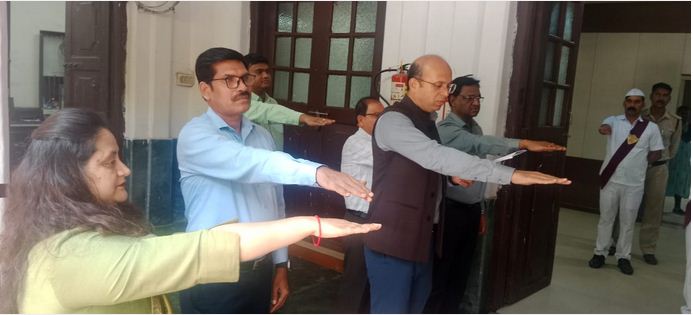 कलेक्टर डॉ.सर्वेश्वर भुरे द्वारा अधिकारी-कर्मचारियों को शपथ दिलाई गई की ‘हम, भारत के नागरिक, लोकतंत्र में अपनी पूर्ण आस्था रखते हुए यह शपथ लेते हैं कि हम अपने देश की लोकतांत्रिक परम्पराओं की मर्यादा को बनाए रखेंगे तथा स्वतंत्र, निष्पक्ष एवं शांतिपूर्ण निर्वाचन की गरिमा को अक्षुण्ण रखते हुए ,निर्भीक होकर, धर्म, वर्ग, जाति, समुदाय, भाषा अथवा अन्य किसी भी प्रलोभन से प्रभावित हुए बिना सभी निर्वाचनों में अपने मताधिकार का प्रयोग करेंगें। इस अवसर पर अपर कलेक्टर श्री बी सी साहू, बी बी पंचभाई भी उपस्थित थे।